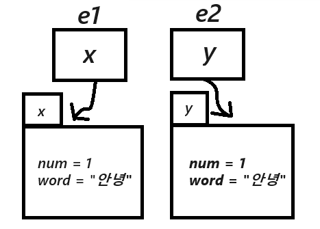 e1는 참조값x를 통해, e2는 y를 통해 그림과 같이 서로 다른 것을 참조하고 있다.