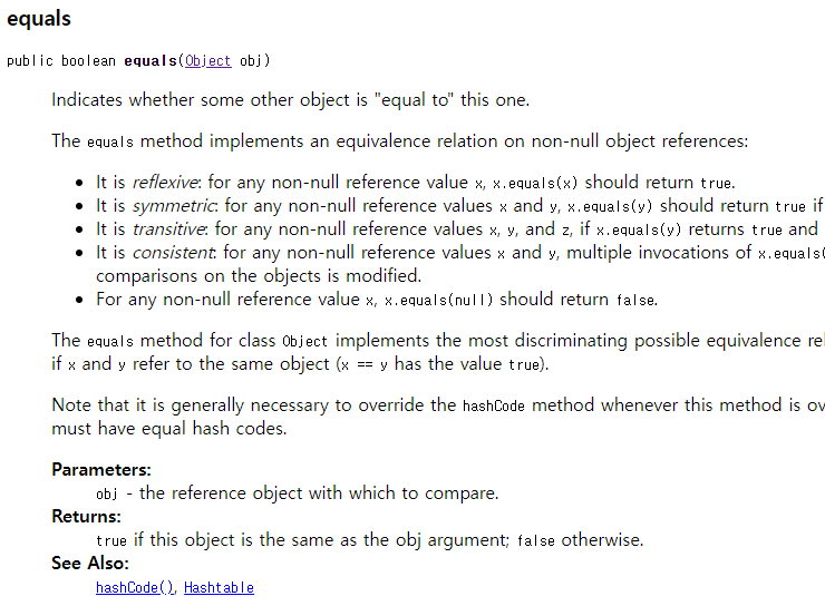 이 메서드는 Object타입의 obj를 넘겨받아서, this object와 같으면 true를 반환한다고 한다.