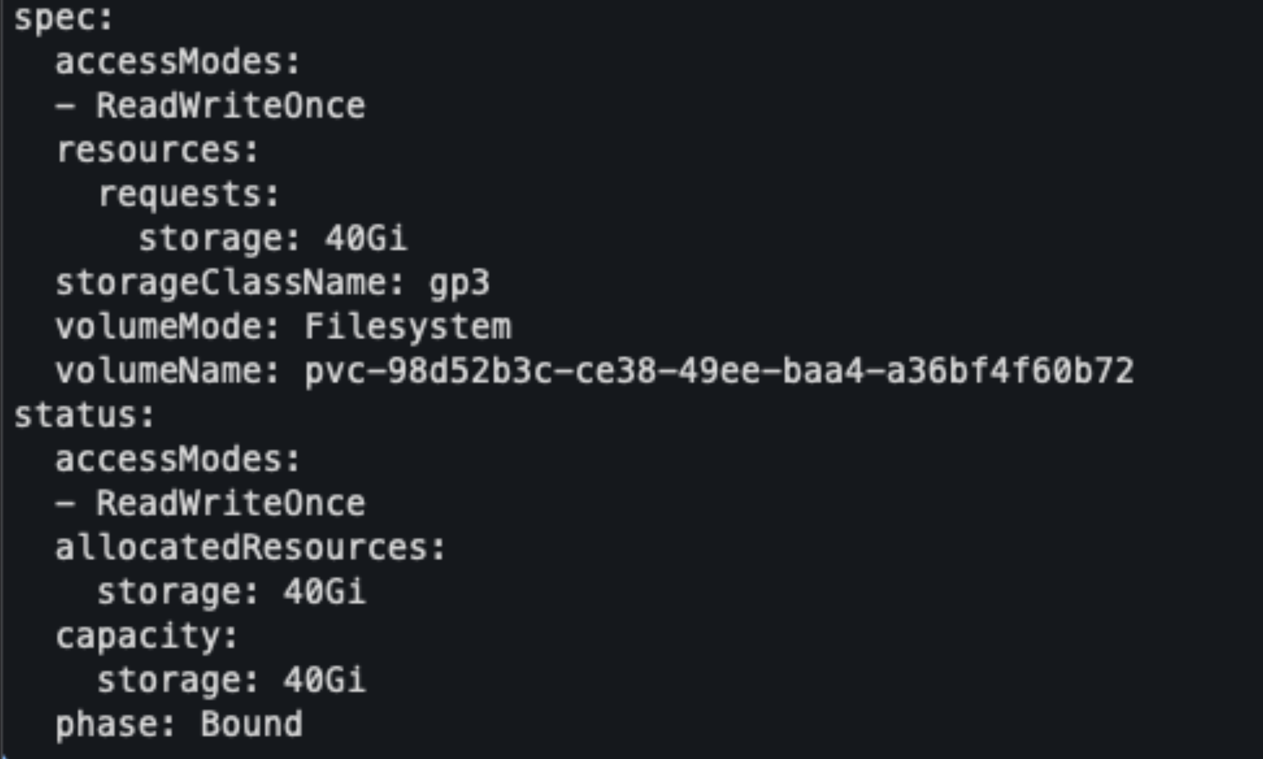 기존 pvc는 30Gi를 Claim하고 있는데, 40Gi로 올려보았다.kubectl edit <pvc-name> # storage 부분 수정