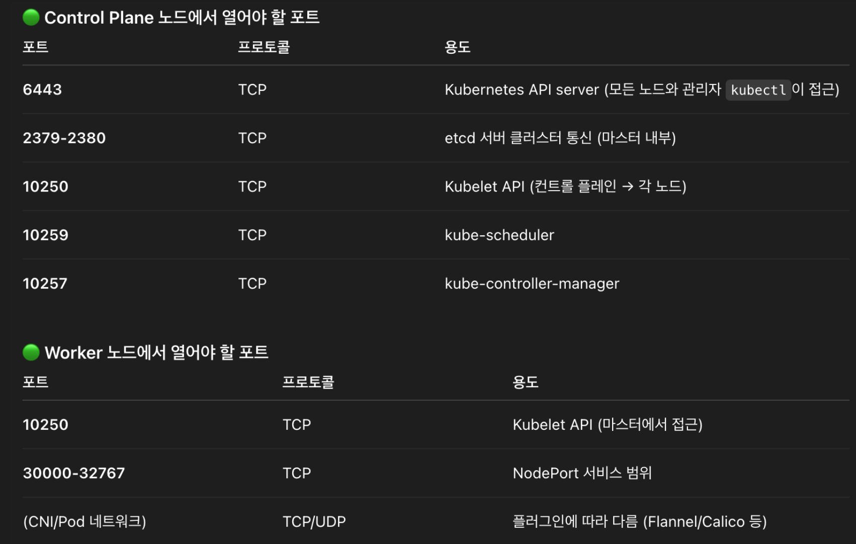 # Master sudo ufw allow 6443/tcp sudo ufw allow 2379:2380/tcp sudo ufw allow 10250/tcp sudo ufw allow 10257/tcp sudo ufw allow 10259/tcp# Worker sudo ufw allow 10250/tcp sudo ufw allow 30000:32767/tcp* CNI/Pod 네트워크로 열어야 하는 포트는 CNI 플러그인(Flannel, Calico, Cilium 등)에 따라 다르므로 별도 설정이 필요할 수 있다.