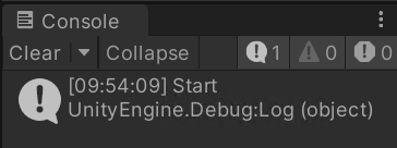 Start()시키면서 Log를 찍어주도록 이 부분에 Debug.Log("Start")코드를 추가해주자.