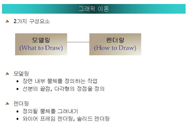 - 모델링: What to Draw. 장면 내부 물체를 정의하는 작업을 말한다. 선분의 끝점, 다각형의 정점을 정의하는 작업에 해당한다.