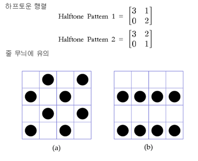 화면 화소에서(컴퓨터 화면에서) 점의 크기는 고정되어있기 때문에 일반적인 하프토우닝을 사용하는 것이 불가능하다.