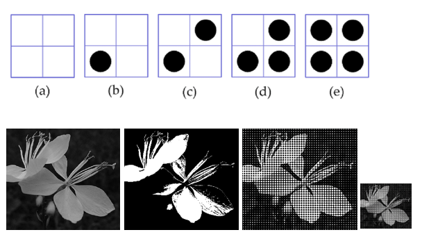 하프토우닝과 달리 해상도 감소 없이(실질적인 해상도는 유지) 그레이 스케일을 잘 표현하려는 방법이다.